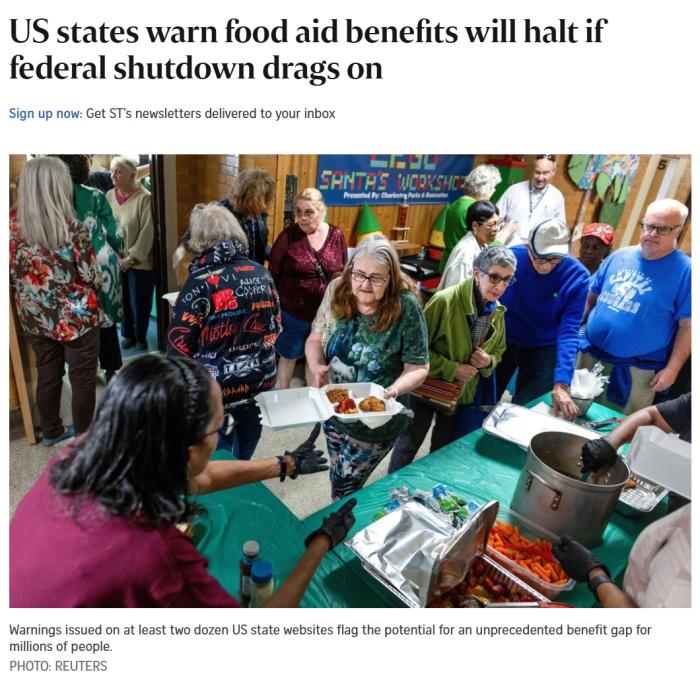 中新网10月27日电 据美国媒体综合报道,美国农业部在其网站发布通知称,报告中的联邦食品将停止发放。 图片来源:外媒报道截图 据美国广播公司(ABC)报道,美国农业部在一份通知中表示:“底线是资金已经枯竭。民主党议员已致函美国” 农业部长要求使用紧急资金来支付下个月的大部分福利。然而,美国农业部24日发布的一份备忘录称:“紧急资金不能合法地用于支付常规福利。”文件解释称,这些资金将用于救助灾区等用途。根据美国《国会山报》报道称,预计未来几天将有超过4000万低收入食品券领取者的福利受到影响。弗吉尼亚州等一些州已宣布将使用州资金来弥补资金缺口,至少是暂时的。但美国农业部的规定不涵盖成本,而且许多州缺乏支付福利的资金。民主党众议院领袖杰弗里斯24日表示:“这是美国对补充营养援助计划最大幅度的削减。今天,共和党人正在从饥饿的儿童、老年人、家庭、妇女和退伍军人的嘴里夺走食物,但却给数十亿捐助者带来巨额税收减免。他们真的关心饥饿吗?”