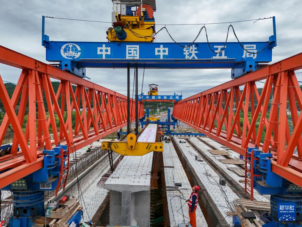 这是10月12日拍摄的京昆高速公路广元至绵阳段驼头河大桥架梁现场(无人机照片)。 10月12日,由中铁五局承建的京昆高速公路广元至绵阳段扩建工程女头哈大桥完成最后一根T梁施工,标志着绵阳市所有线路站稳,为全线建成通车奠定了坚实基础。京昆高速公路广元段扩建工程完成后,川陕主干公路交通量进一步增加,成为华中、华北地区成渝地区乃至我国西南地区的又一条马布利斯通道。g 中国、京津冀地区。新华社记者 王曦 摄