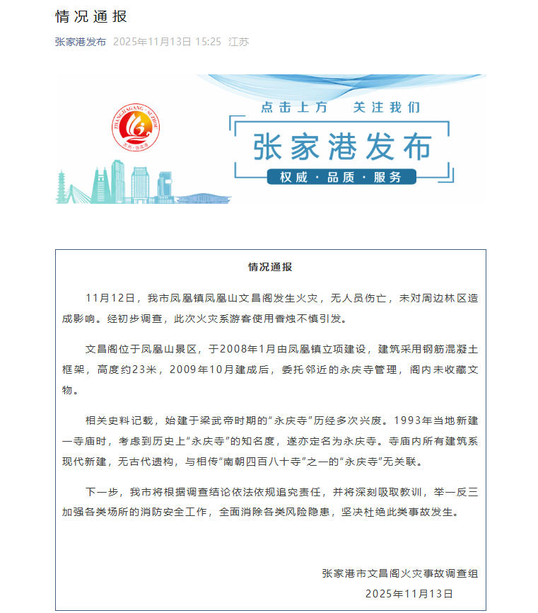 官方通报:张家港凤凰山文昌阁起火系游客误用香烛所致